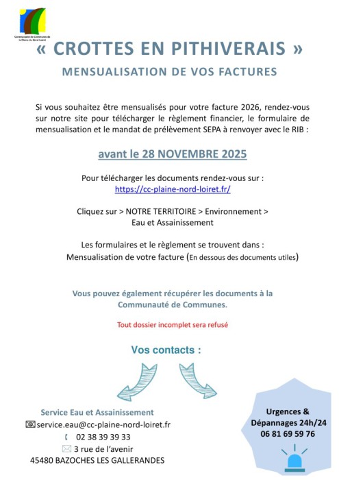 Le règlement du service de distribution d'eau potable est disponible sur le site de la Communauté de Commune à l'emplacement suivant : https://cc-plaine-nord-loiret.fr/wp-content/uploads/2024/02/Reglement-service-Eau-CCPNL.pdf
