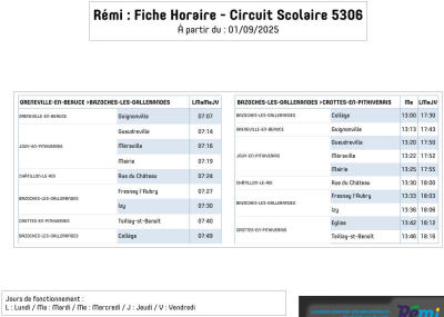 Cliquez sur ce lien pour accéder à la dernière mise à jour de la fiche 5306 ou sur le logo Rémi pour retrouver l'ensemble des circuits scolaires