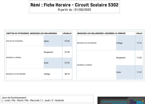 Cliquez sur ce lien pour accéder à la dernière mise à jour de la fiche 5302 ou sur le logo Rémi pour retrouver l'ensemble des circuits scolaires
